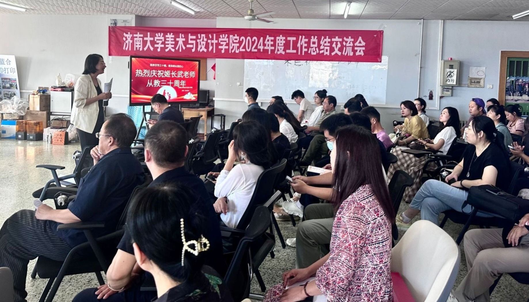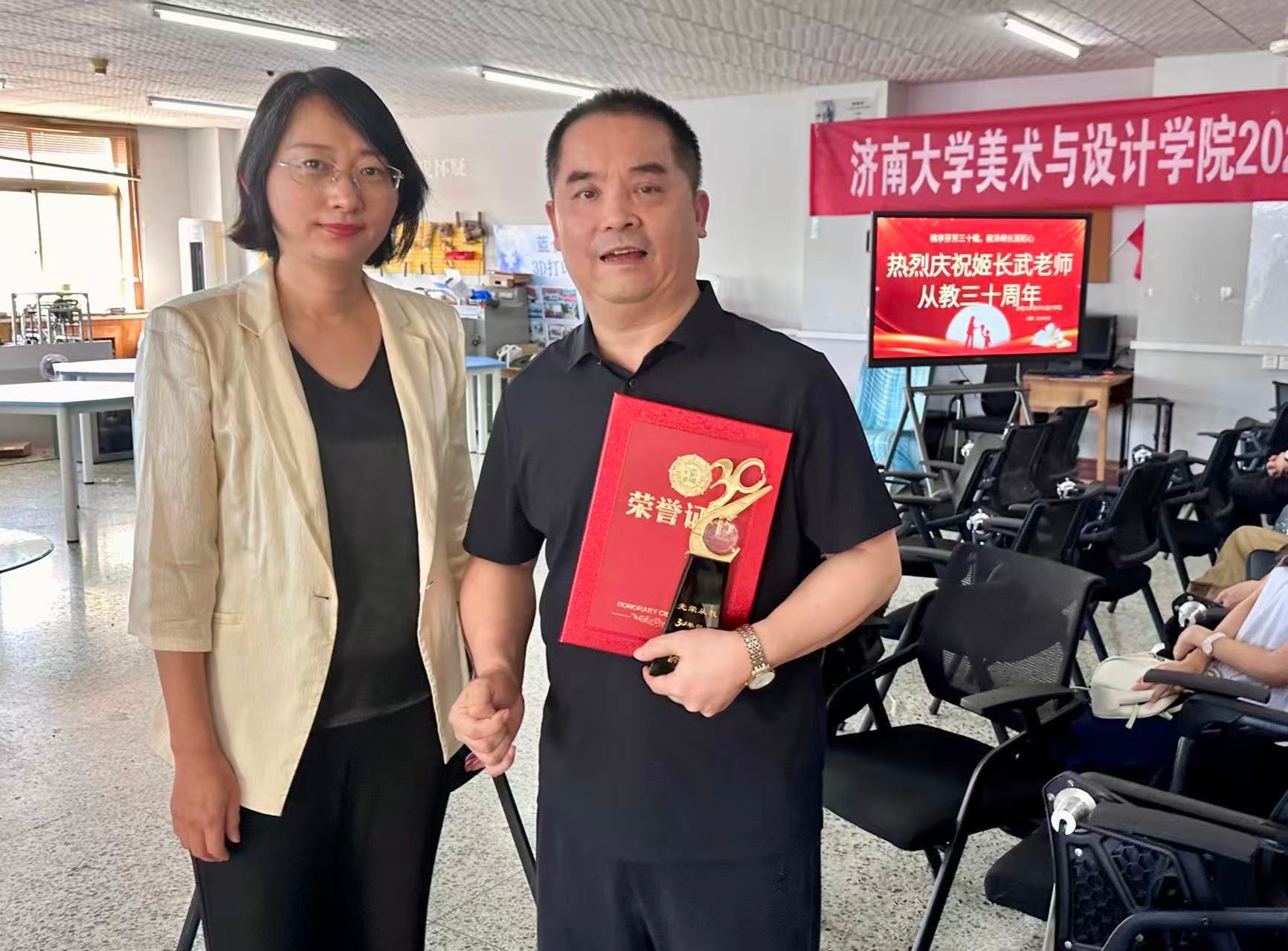 会议首先向从教三十周年的姬长武老师颁发荣誉证书和纪念奖杯,全场以热烈掌声向姬老师表示崇高敬意。