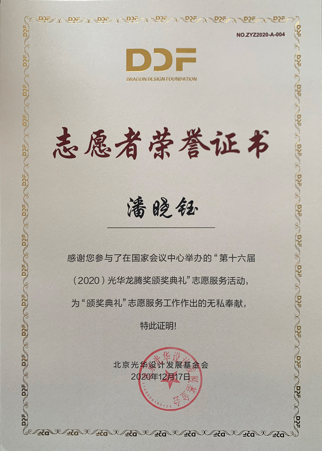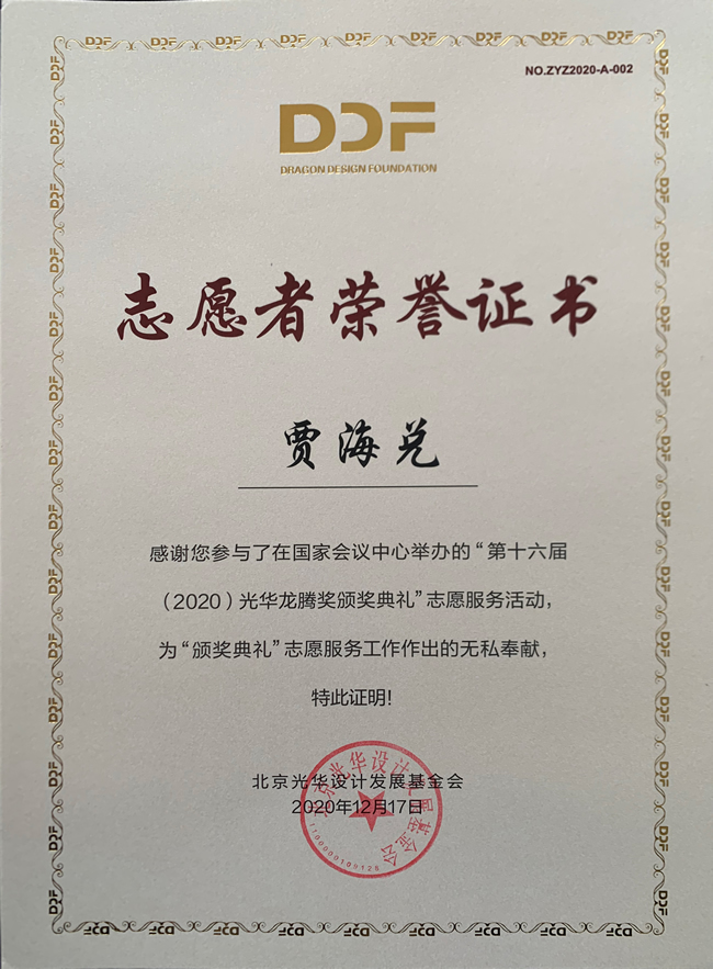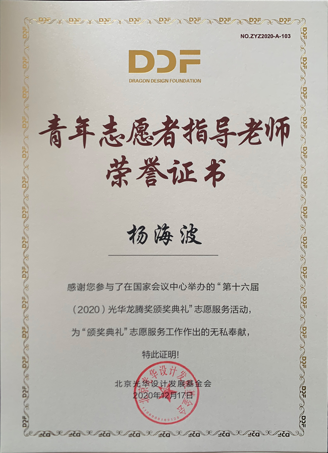志愿服务队”在杨海波老师指导下,2019级研究生张楠、贾海兑,2020级研究生潘晓钰、唐畋畋、王孝同等同学累计进行了100余小时的志愿服务,服务内容包括图文设计、新闻撰写、网站维护等专业服务,设计方案得到与会专家的高度认可,为第十六届光华龙腾奖颁奖典礼举行做出了突出贡献。