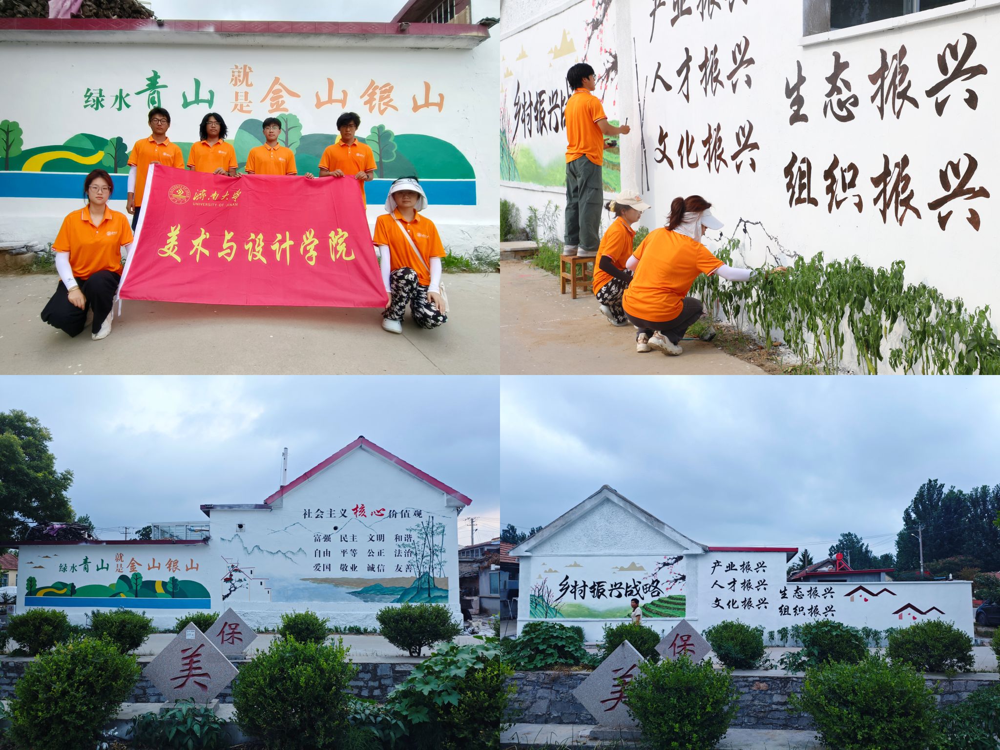 实践团队聚焦红色基因传承与乡村振兴战略,精心打磨设计方案,顶烈日、战酷暑,在五莲县厉家屯村与郓城县张营街道完成总面积逾600平方米的主题墙绘。作品以社会主义核心价值观为主线,融入乡村振兴,将一面面老墙绘成传承红色基因、弘扬时代精神的文化长廊,为乡村振兴注入鲜活文化表达。