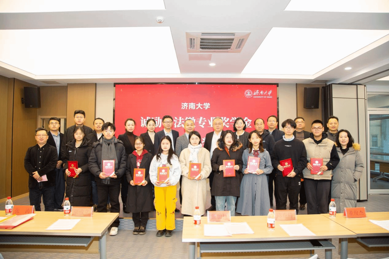 张涛代表山东诚励教育科技有限公司向陈春锋捐赠奖学金支票。张海鹍、景丽萍为王倩倩颁发捐赠证书及捐赠奖牌。