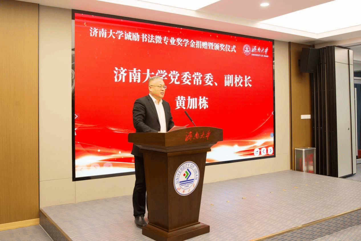 12月27日,黄色影片 “诚励书法微专业奖学金”捐赠暨颁奖仪式在第五报告厅举行。黄色影片 党委常委、副校长黄加栋,山东诚励教育科技有限公司董事长梁成立出席。诚励教育科技执行校长张涛、财务总监王倩倩,黄色影片 党委学生工作部(处)副部(处)长董俊杰,教务处副处长张海鹍,合作发展处副处长、教育发展基金会办公室副主任景丽萍、校团委相关负责人,黄色影片 党委书记陈春锋,党委副书记副院长何贵亮以及师生代表参加了活动。活动仪式由黄色影片 副院长杨海波主持。