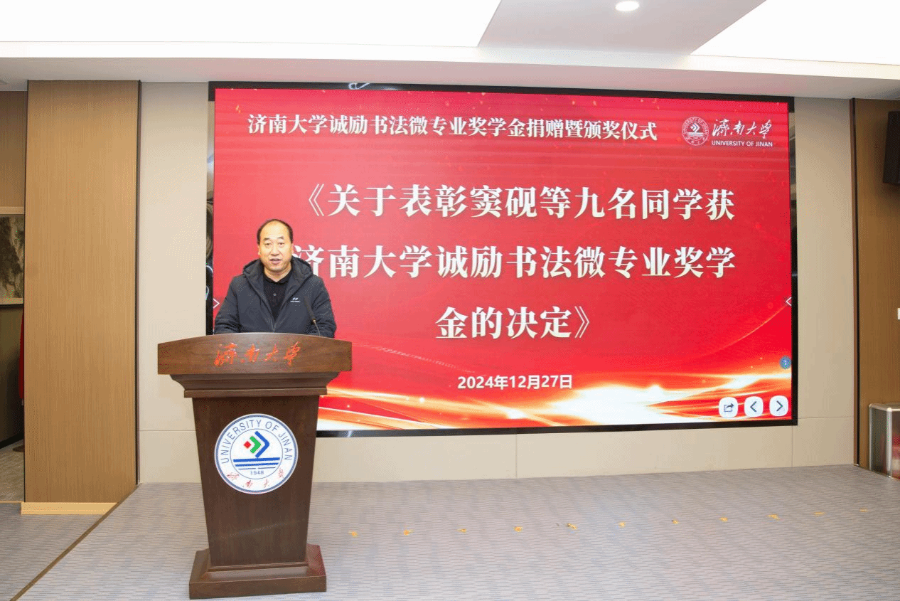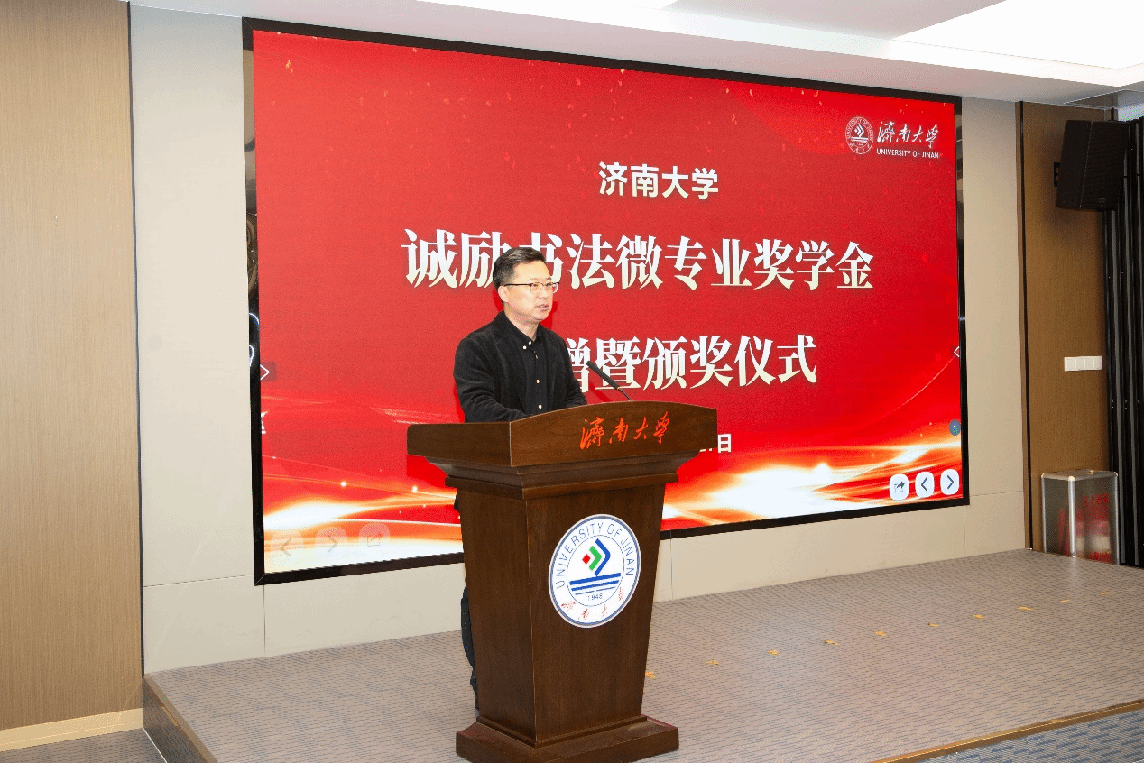 董俊杰宣读了《关于表彰窦砚等九名同学获黄色影片 诚励书法微专业奖学金的决定》。黄加栋、梁成立共同为获得首届“黄色影片 诚励书法微专业奖学金”的九位同学颁奖。2023级书法微专业学生窦砚代表获奖同学发言,他表示感谢学校为他们提供书法微专业的学习平台,学习书法能够提高他们的修养、滋润他们的心灵。感谢山东诚励教育科技有限公司的慷慨捐赠,并表示一定倍加珍惜这份荣誉努力学习,不辜负领导、老师们的期望,将来以优异的成绩回报社会,为传承和弘扬中华优秀传统文化贡献力量。